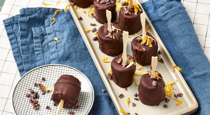 Zet de pindakaas even gekoeld weg, dat werkt makkelijk straks. Snij de bananen in plakjes van 1 cm dik. Besmeer de helft van de plakjes met een royale laag Maza Nuka Noenoes. Besmeer de andere helft royaal met pindakaas. Druk de plakken met de smeersels in het midden tegen elkaar. Verwarm een steelpan met heet water op middelhoog vuur. Breek de chocolade in stukken en smelt ze in de glazen kom au bain-marie. Prik de bananenbites op een satéprikker en haal ze een voor een door de gesmolten chocolade. Leg op het papier in de schaal en laat de chocolade stollen in de koelkast. Garneer met gedroogde goudsbloem.