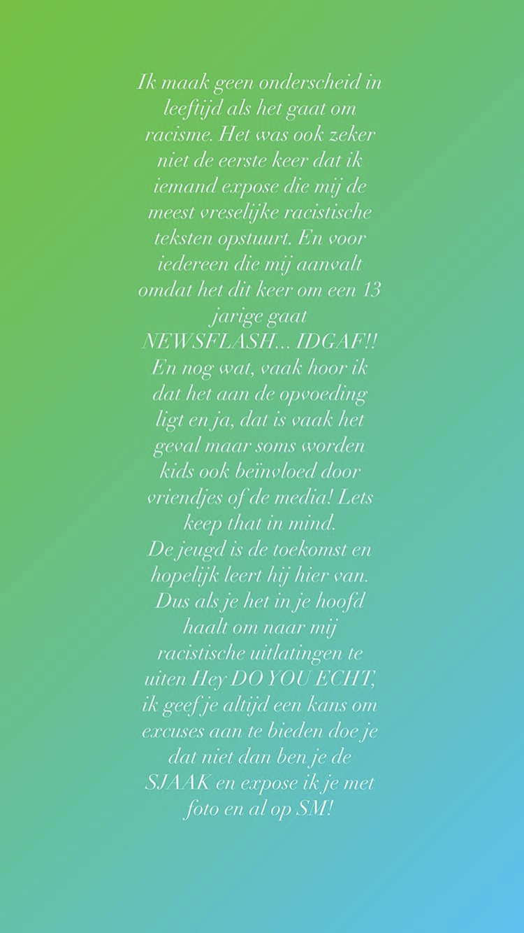 Op Instagram Stories reageert de zangeres nu opnieuw. “Ik maak geen onderscheid in leeftijd als het gaat om racisme. Het was ook zeker niet de eerste keer dat ik iemand expose die mij de meest vreselijke racistische teksten opstuurt”, schrijft ze. “En voor iedereen die mij aanvalt omdat het dit keer om een 13-jarige gaat heb ik nieuws: I don’t give a fuck.”