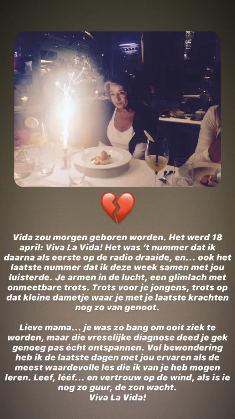 Op Instagram plaatst Mark een emotioneel bericht. “Vida zou morgen geboren worden. Het werd 18 april: Viva La Vida! Het was ’t nummer dat ik daarna als eerste op de radio draaide, en… ook het laatste nummer dat ik deze week samen met jou luisterde”, schrijft de 538-dj. “Je armen in de lucht, een glimlach met onmeetbare trots. Trots voor je jongens, trots op dat kleine dametje waar je met je laatste krachten nog zo van genoot.”