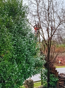 Maar nee hoor. De glasvezel werd omhoog gesjord uit de grond en hoog in de mast aan een kastje ‘geconnect’. Onze ‘supersnelle wifi’ komt toch weer binnen via een kabel hoog boven de zwiepende bomen, vastgespijkerd onder onze dakgoot.