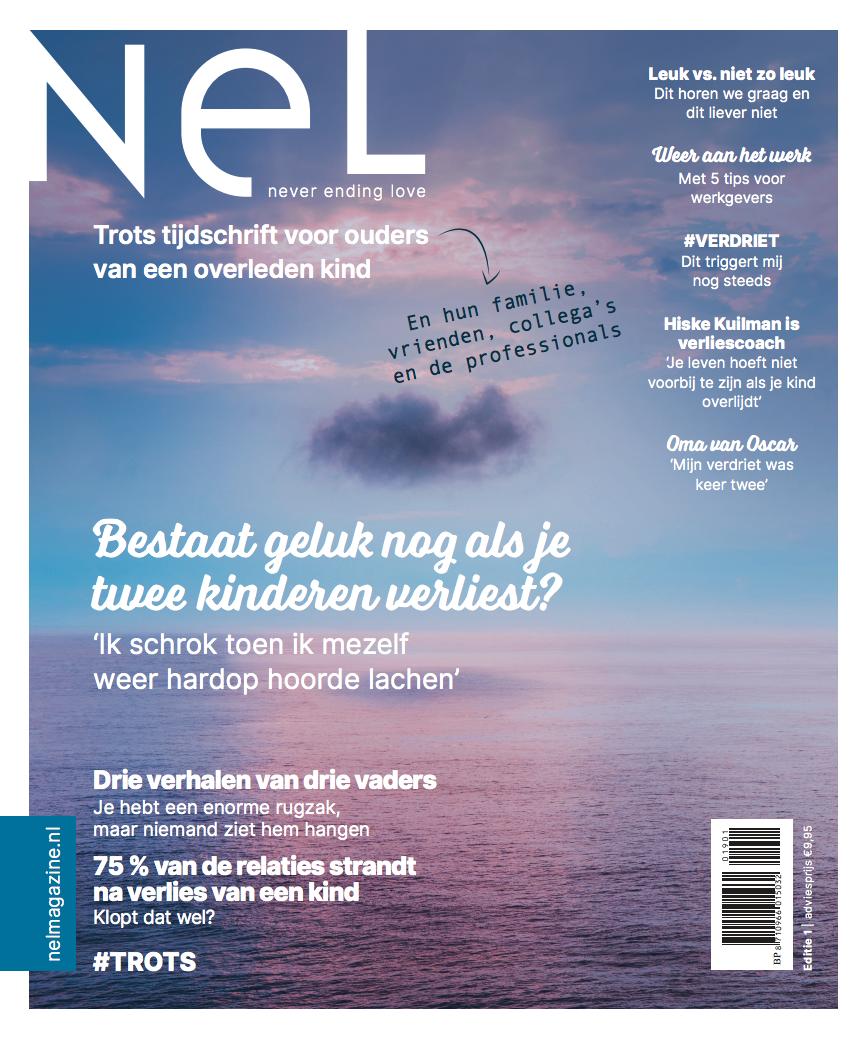 “Voor Benja’s overlijden had ik nooit de moed en het vertrouwen gehad om voor mijn eigen dromen te gaan. Een tijdschrift beginnen, was wel erg risicovol. Zou ik de kwaliteiten in huis hebben? Ik zou het idee niet eens serieus nemen. Maar doordat ik nu niet meer bang ben, durf ik voor dingen te gaan die ik de moeite waard vind. En dat is zo goed gebleken. Sinds ik mijn hart volg, is mijn leven betekenisvoller en waardevoller geworden. Vanuit mijn verdriet heb ik, samen met nog meer ouders die dit verlies hebben meegemaakt, nu iets moois neergezet. NEL Magazine is een glossy met diepgaande interviews, ervaringsverhalen, inspiratie, troost, tips en adviezen voor ouders die een kind hebben verloren. Maar NEL Magazine is ook voor hun omgeving. Want hoe kan je iemand steunen of beter begrijpen na zo’n groot verlies? Wat kan je doen als familielid, vriend, collega of werkgever? Ik hoop dat NEL Magazine ouders laat zien dat er naast verdriet ook een liefde blijft die nooit over gaat. Vandaar de naam: Never Ending Love. Ik hoop ook dat de glossy moeders aanmoedigt om trots te zijn op zichzelf. Want als het je lukt om na zo’n drama iedere dag op te staan en zelfs nog kunt lachen dan ben je geniaal. Dan kan je eigenlijk alles aan. Dan kan je niet alleen heel trots zijn op je kind, maar ook héél erg trots op jezelf.”